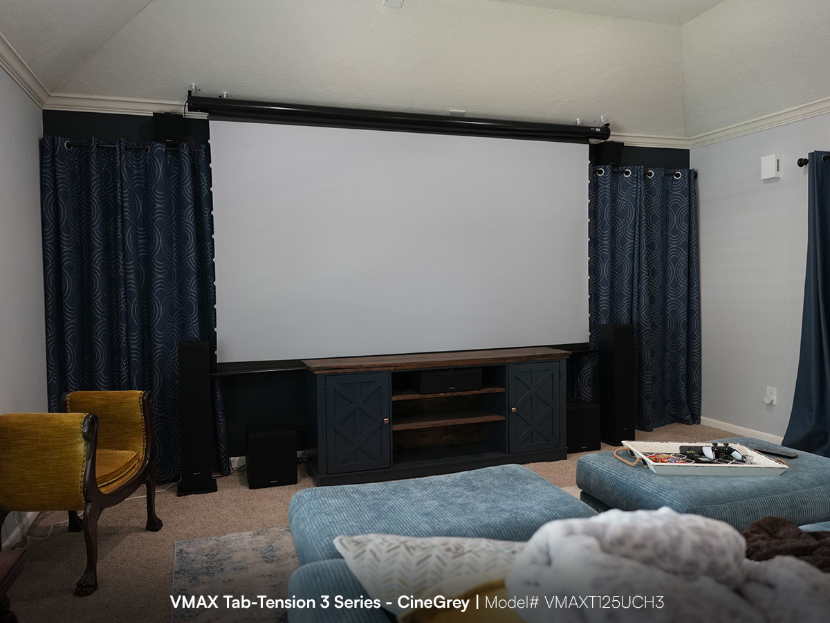 Electric motorized tab-tension projector screens that are suitable for both commercial and home theater applications. Tab-tension design provides taut and uniform flatness over the entire projection surface.
